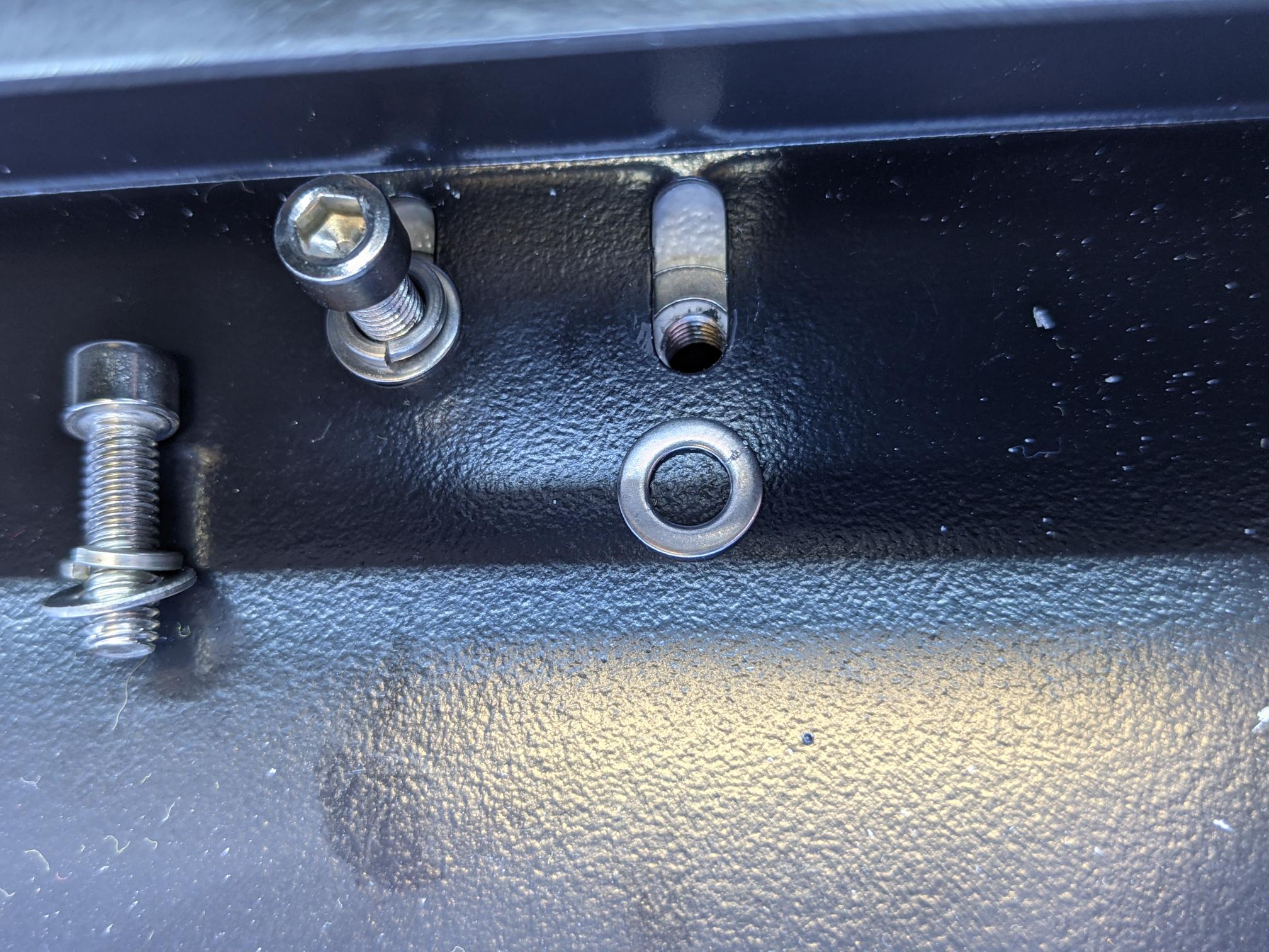 4. Raise or remove the table and place a shim on the corner bracket that is offset, between its (2) bolts or place the washers on the brackets bolt holes to compensate for the offset difference as shown in Figure 4 below. For example the thickness gauges offset in Figure 2 above measured 0.050" lower in one corner than the other corners, the acquired washer is 0.025" so placing 2 washers on top of each other underneath the black Z axis tables, bolt holes compensates that corners flatness offset.