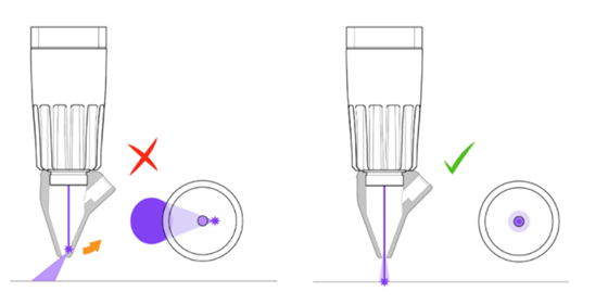1. Assure the alignment of the first 2 mirrors are correct then most importantly the 3rd mirror is shooting out of the laser in the center of the nozzle. By placing a piece of painters tape on the bottom of the nozzle and pressing lightly on the tape to create an outline of the nozzle, and its smaller opening (it will imprint a circle in a circle), assure the output from the pulse is centered. If the 3rd mirror is not aligned to the center, the laser can bounce off the nozzle and cause undesired results as shown below.