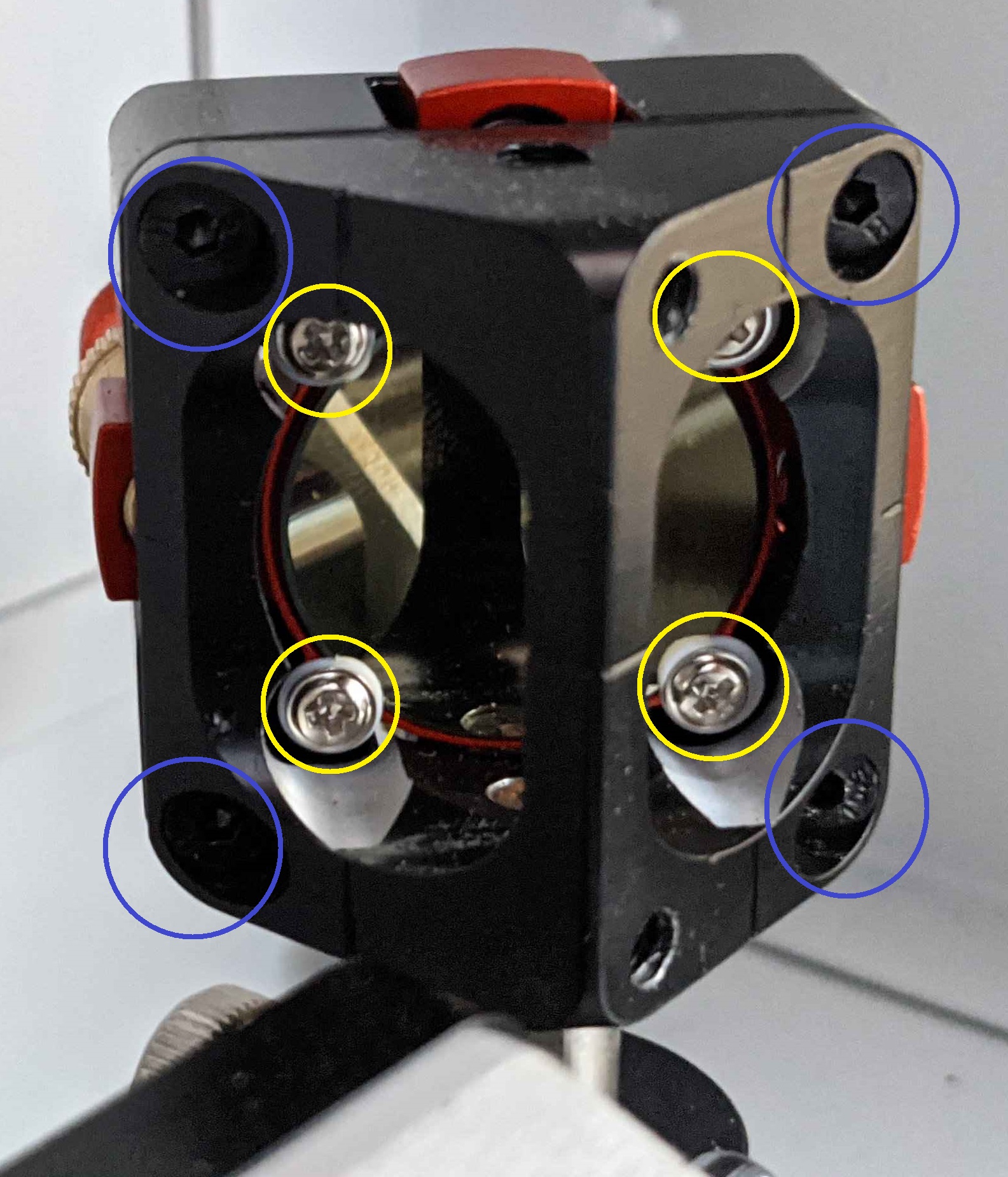 1. On top of the lasers head remove the 2x silver screws using the 1.5mm Allen key, indicated in blue circles in Figure 5 below.