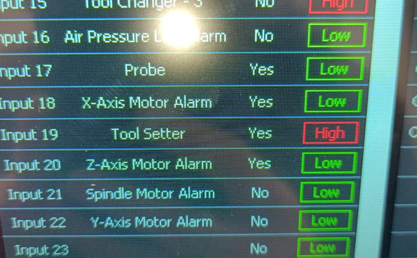 6. Get someone to lightly press down the new tool setter. You should see the "tool setter" input go from "LOW" (green) to "HIGH" (red). This confirms the tool setter is working properly.