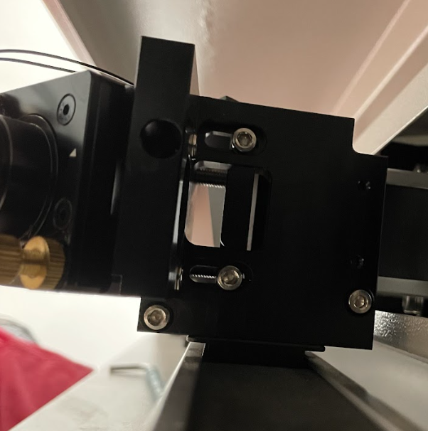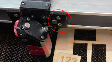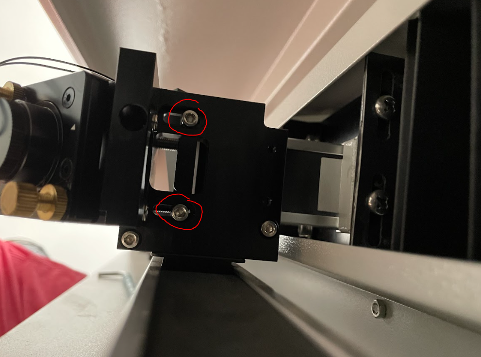 To allow some slack in the belt so you can pinch both ends at the laser head, loosen the 2 bolts seen in the photo below (LEFT side of gantry).